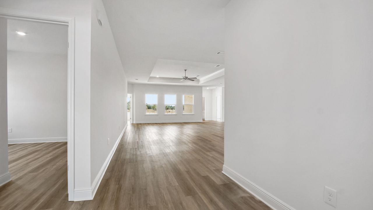 Welcome to 180 Farm Owl Drive, a new home under construction at Owl's Head Farms in Freeport Florida. As you enter this floorplan, you are immediately drawn into the expansive great room, where the open concept design showcases 9' ceilings with additional tray ceilings in the open living room. As you enter the open living space there is an appointed dining room allows for a formal dining option. The kitchen is designed with an open concept and features elegant quartz countertops with white cabinetry to complement. A tile backsplash finishes out this space along with matte black plumbing fixtures.