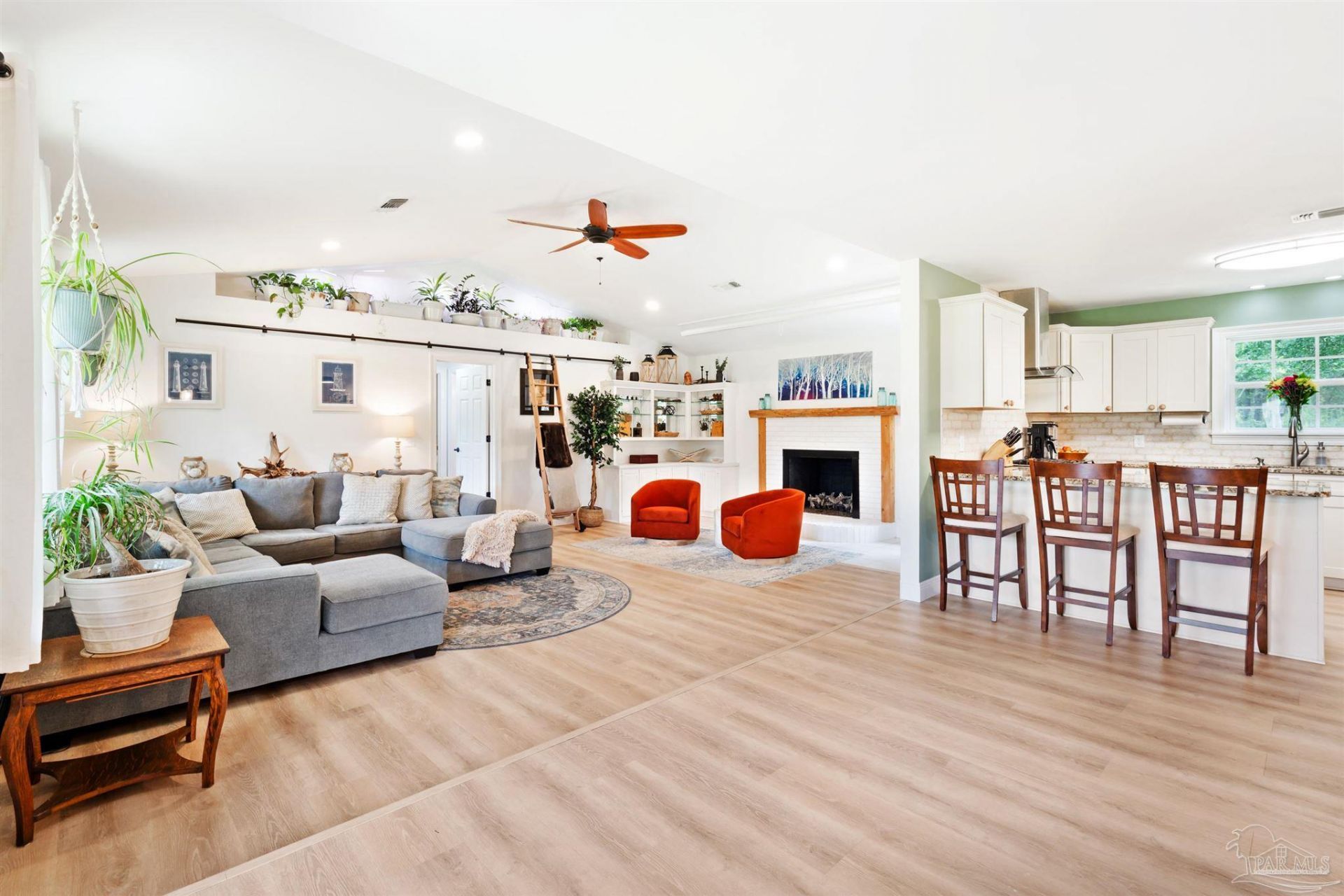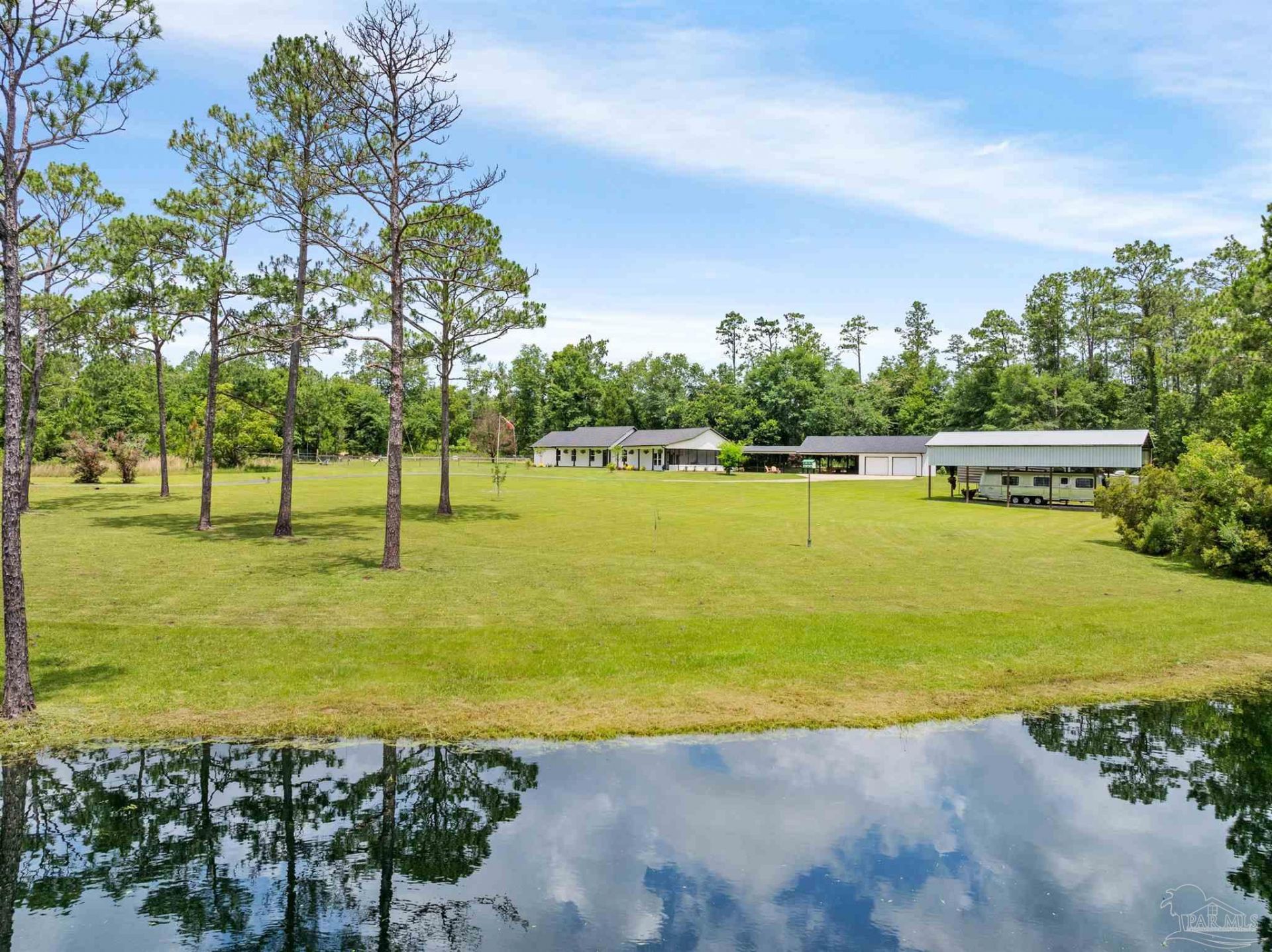32 ACRES + FULLY RENOVATED HOME + STOCKED POND + BOAT & RV STORAGE + AIRBNB POTENTIAL + 20 MINUTES TO THE BEACHFully renovated private estate on 32 acres just 10 minutes from Hwy 90 & I-10, 20 minutes to the white sand beaches of Gulf Shores and Orange Beach. The beautifully updated 3 bedroom, 2 bath home features a bright open-concept floor plan with soaring ceilings, abundant natural light, and luxury vinyl plank flooring throughout. Quality craftsmanship is evident throughout with custom built-ins, designer finishes, and a gas fireplace anchoring the spacious living area.The chef's kitchen is thoughtfully designed with granite countertops,...read more