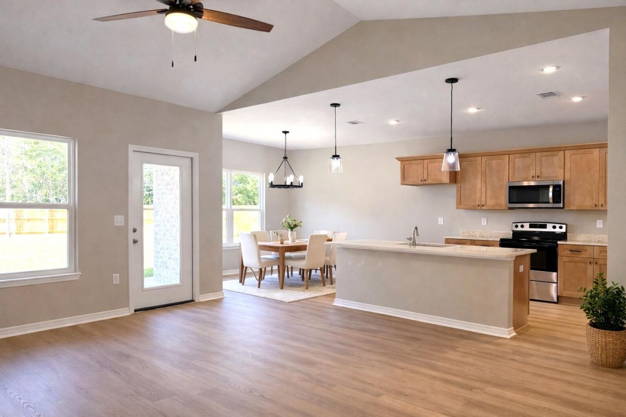 Move-in ready and built to impress--this beautifully crafted home delivers quality, comfort, and value all in one. Situated on a spacious lot, the full brick exterior sets the tone for durability and timeless appeal. Inside, an open-concept layout welcomes you with LVP flooring throughout, a bright living space, and a designer kitchen featuring quartz countertops, center island, and seamless flow into the dining area. The split floor plan offers privacy, with a spacious primary suite boasting dual vanities and a walk-in closet, while guest bedrooms are generously sized. Added value comes standard with installed window blinds, a 6' privacy...read more