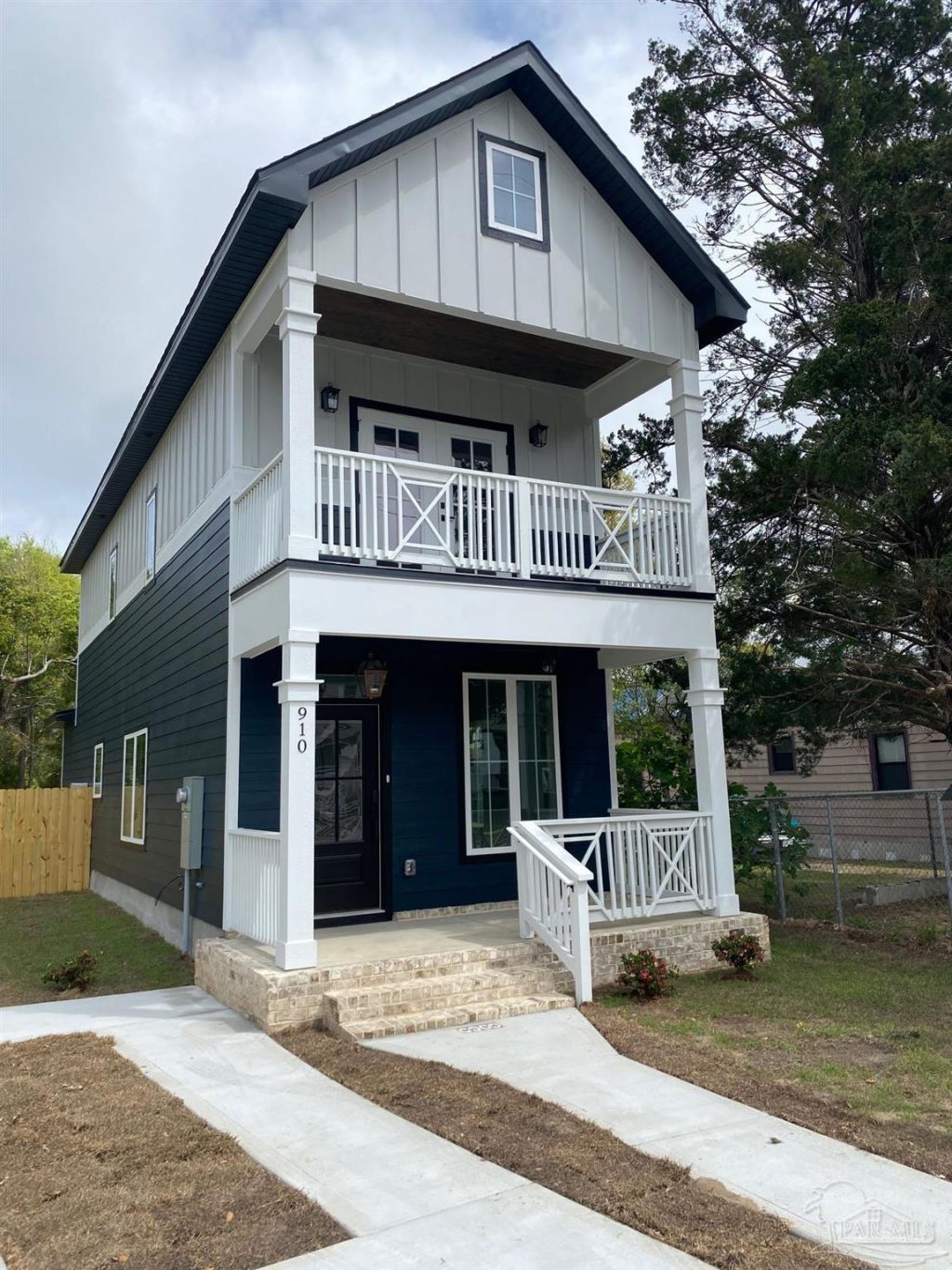 The charm of this downtown Pensacola home embraces you from the front porch with details like address tile at the front brick stairs, custom design and built porch railings, gas lit copper ceiling light fixture and a ceiling fan. Porch ceiling and upstairs balcony has stained wood planks. The front door opens to a welcoming open concept living, dining and kitchen areas. 9' ceilings downstairs and upstairs. 1/2 bath downstairs blooming with personality! Kitchen includes stainless appliances, quartz countertops, white countertops, custom herringbone pattern tile backsplash. Window above kitchen sink allows so much sunlight. Just around the...read more